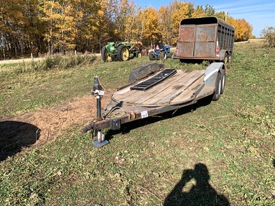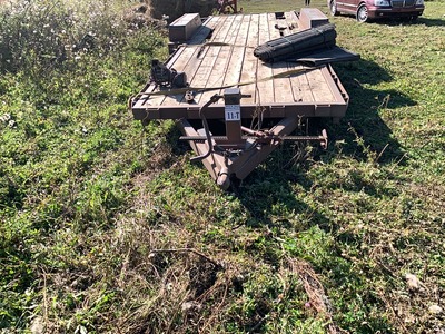 16' T/A BUMPER PULL TRAILER - ORIGINALLY A STOCK TRAILER. w/ 1- RAMP, WOOD DECK, MISMATCHED TIRES. s/n N/A |