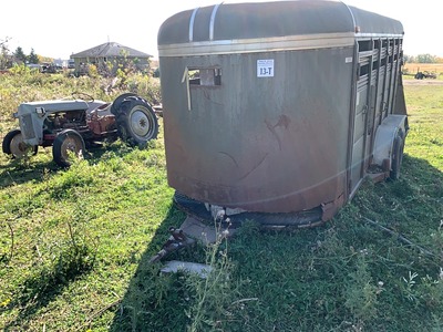 1992 PRAIRIE 16' T/A STOCK TRAILER - NOT REGISTERED IN ALBERTA w/ 2- 3,000 LB AXLES, GVWR 3102 KG, SIDE DOOR, SPLIT REAR DOOR, MID DIVIDER. NO JACK. SELLS WITH CONTENTS INCLUDING ASSORTED FEED & MINERAL TUBS, 2- LADDERS. s/n 1P0TSA3B2MT031755 |