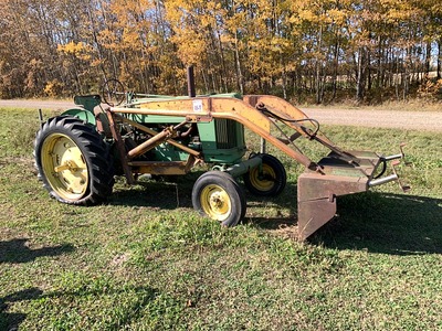 JD 60 2WD TRACTOR w/ HRS UNKNOWN, 540 PTO, 3 PTH, FIRESTONE 12-38 REARS, 6.50-16 FRONTS. FEL w/ 5' BUCKET. TIRE CHAINS TO FIT TRACTOR SELL IN LOT 21T. NO BATTERY, NEEDS SPARK PLUG WIRES, HAS CRACKED INTAKE MANIFOLD. SELLER STATES ENGINE NOT SEIZED. s/n 6001400 |
