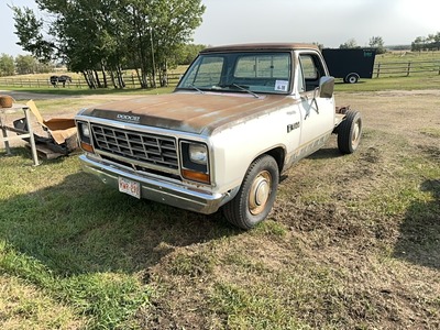1982 DODGE RAM 250 CUSTOM 2WD REG CAB TRUCK w/ SHOWING 84,806 ORIGINAL KMS, 360 2 BARREL V-8 GAS ENGINE, AUTOMATIC TRANSMISSION, LEATHER BENCH SEAT, MANUAL WINDOWS, MANUAL LOCKS, HEAT, RADIO, NEW CARB, NEW FRONT BRAKES, COMES WITH BOX, TAILGATE AND CHROME TRIM s/n B7JD24S1CS225200 |