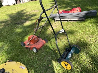 2- LAWN MOWERS w/ 1 IS A YARDWORKS 14" REEL TYPE PUSH MOWER & 1 IS A GE 14" ELECTRIC MOWER |