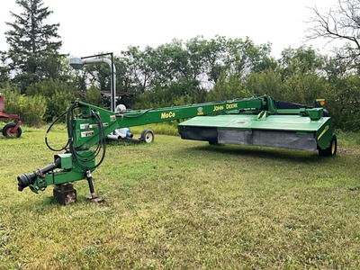 JD MOCO 956 14' HYDROSWING DISCBINE w/ 1000 PTO, FLAIL CONDITIONER, TRANSPORT LIGHTS, 31X13.5-15 TIRES s/n E00956T310943 |