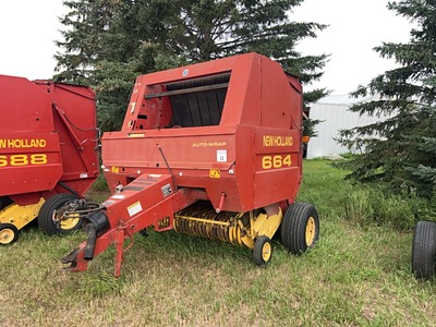 NH 664 AUTO WRAP RD BALER w/ 540 PTO, TWINE ONLY, BALE KICKER, 31X13.50-15 NHS TIRES s/n 942179 LOTS 10 TO 11 ARE GROUPED TOGETHER, THIS DOES NOT MEAN YOU HAVE TO BUY ALL LOTS IN THIS GROUP, BUT THE BIDDING WILL REMAIN OPEN ON ALL THE LOTS UNTIL THERE ARE NO MORE BIDS ON ANY LOT AT THEIR CLOSING TIME. |
