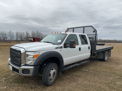 2015 FORD F550 XLT 4x4 QUAD CAB S/A FLAT DECK TRUCK SHOWING 70,364 KMS, 6.8LTR GAS ENGINE, AUTO TRANSMISSION, POWER WINDOWS, POWER LOCKS, AIR, TILT, CRUISE, CLOTH INTERIOR, SEATS 6, SLIDING WINCH STRAPS, TIE HOOKS, 8' (W) x 140" (L) WOOD DECK, HEADACHE RACK, REAR PINTAL HITCH, TOOLBOX, FLIP UP GOOSENECK RUBBER FLOORING, WINTER FRONTS s/n 1FD0W5HY8FEB46918 https://vhr.carfax.ca/?id=BIYtwn7l2jME7%2BmUyJhWDf4aApDmgm0F LOTS 1 TO 4 ARE GROUPED TOGETHER, THIS DOES NOT MEAN YOU HAVE TO BUY ALL LOTS IN THIS GROUP, BUT THE BIDDING WILL REMAIN OPEN ON ALL THE LOTS UNTIL THERE ARE NO MORE BIDS ON ANY LOT AT THEIR CLOSING TIME. |