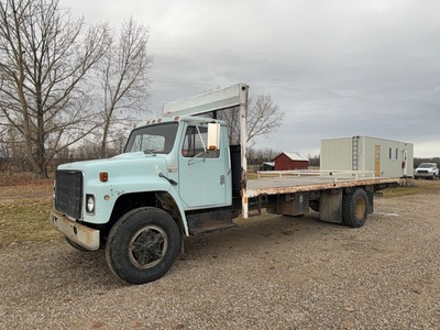 1983 INT 1700 S/A DECK TRUCK SHOWING 196, 775 KMS, 366 TRANSPLANT PROPANE ENGINE, 5 + 2 TRANSMISSION, MANUAL WINDOWS, MANUAL LOCKS, HEAT, RADIO, REAR PINTAL, STRAP WINCHES, 8'(W) x 23' WOOD DECK, HEADACHE RACK, 92" X 93" BOX INSERT, MANUAL ROLL TARP s/n 2HTAA17B3DCA12792 LOTS 1 TO 4 ARE GROUPED TOGETHER, THIS DOES NOT MEAN YOU HAVE TO BUY ALL LOTS IN THIS GROUP, BUT THE BIDDING WILL REMAIN OPEN ON ALL THE LOTS UNTIL THERE ARE NO MORE BIDS ON ANY LOT AT THEIR CLOSING TIME. |